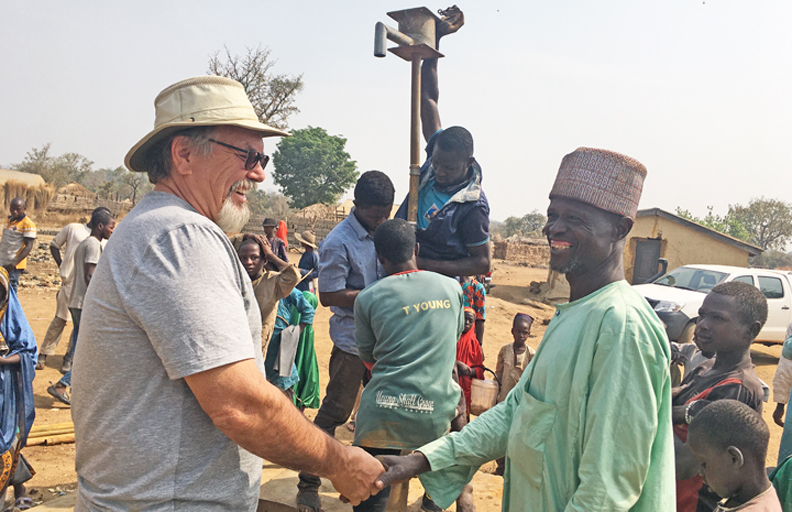 In this 2020 scene, Hamiltonian Rick Bradford shakes hands with a Hausa chief grateful for help to repair his town’s water pump. Bandits in the area, near Egbe, Nigeria, now make such mission help impossible.