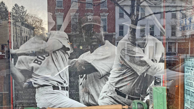 One day while in front of a vintage baseball shop on Main Street in Cooperstown I saw what looked like the ghosts of Ted Williams, Jackie Robinson and Babe Ruth. Near the Baseball Hall of Fame and Doubleday Field, baseball’s official birthplace, there they were in the storefront glass, reflected against buildings and trees like ghosts close enough to touch.