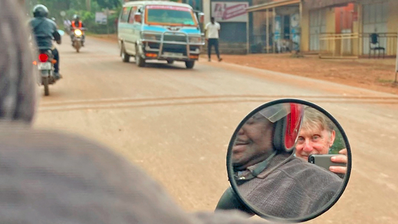 The writer’s view from the back of a boda-boda driven by a Ugandan named Godfrey.