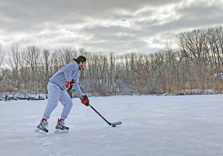 A hockey player enjoys the open space of a frozen Lake Jojo, also known as the Dundas Marsh.